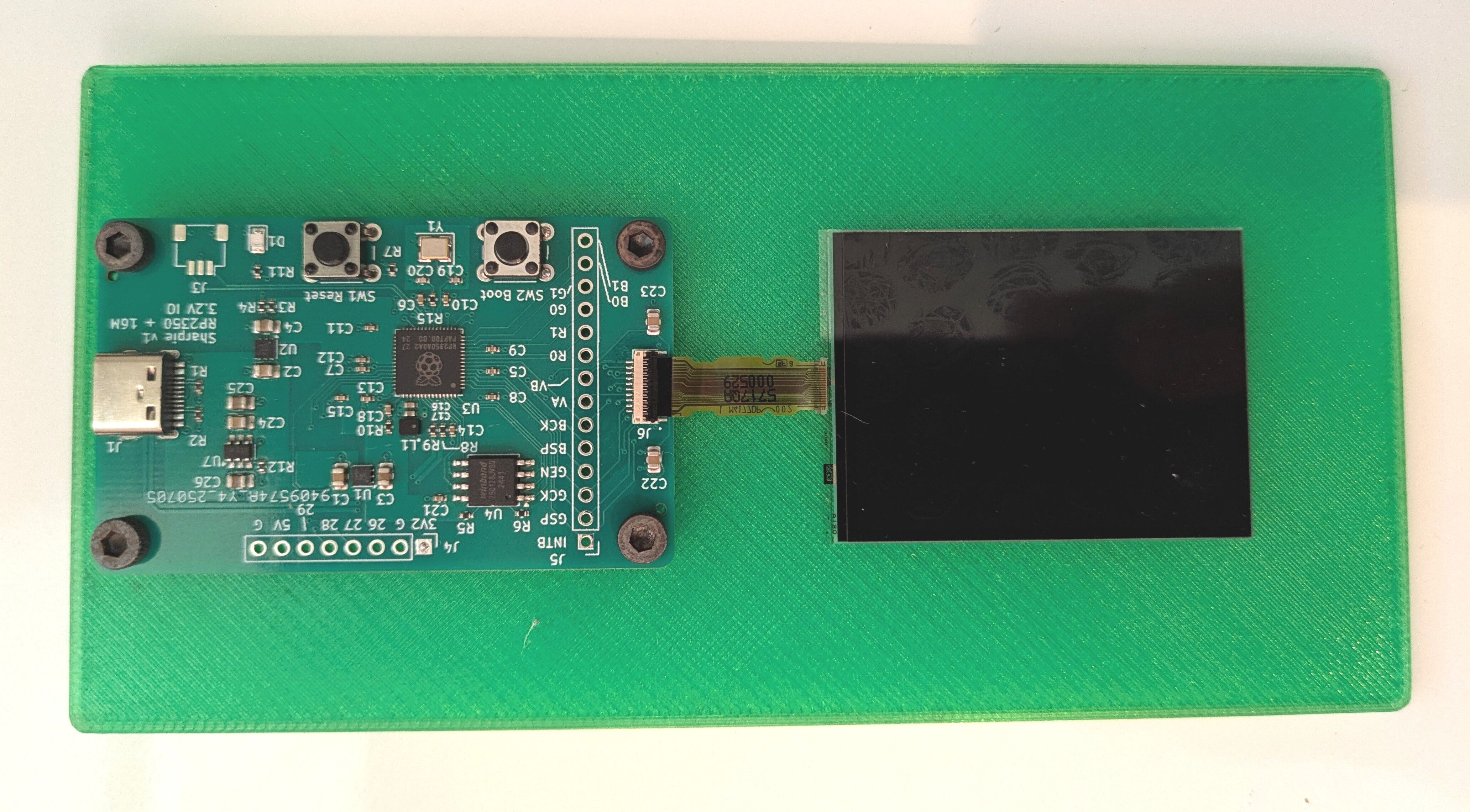 Last time, I got the boards and one actually showed up on USB. Since then, I soldered the connector onto the board (the trick is applying liquid flux and using the Pinecil's chisel tip with solder on the rear side), programmed the 60Hz VA and VB/VCOM signals, found a bug in the waveform code (the second DMA was transferring twice as much data as it's supposed to, so it was staying in progress between re-configurations of the PIO), built a stupid plastic carrier, and tested the screen. It doesn't work.
