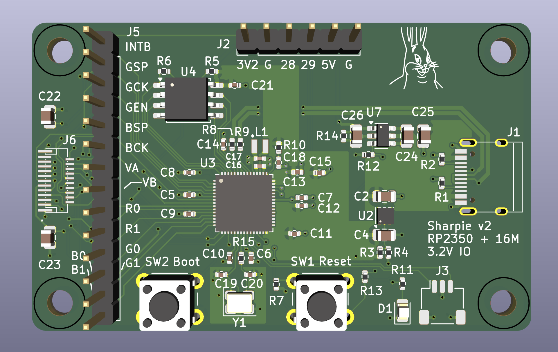 Revision 2 cleans up the design. It wires the display connector properly, has a pull-up resistor on the RP2350's reset line, doubles the LED resistor to make it dimmer, takes out two extra GPIO pins to make routing a little easier, removes the 3.3V regulator since every component and power supply can run at 3.2V, adds a resistor on the charge pump output to cause 5V to drop quickly when the charge pump is disabled (currently it takes several seconds to fall, and Sharp says to "please not use extremely slow power source"), and adds board art of my choosing at the pedantic request of a friend. (Future boards, in this project or another, may feature chibi anime women if sufficient resources are available.)