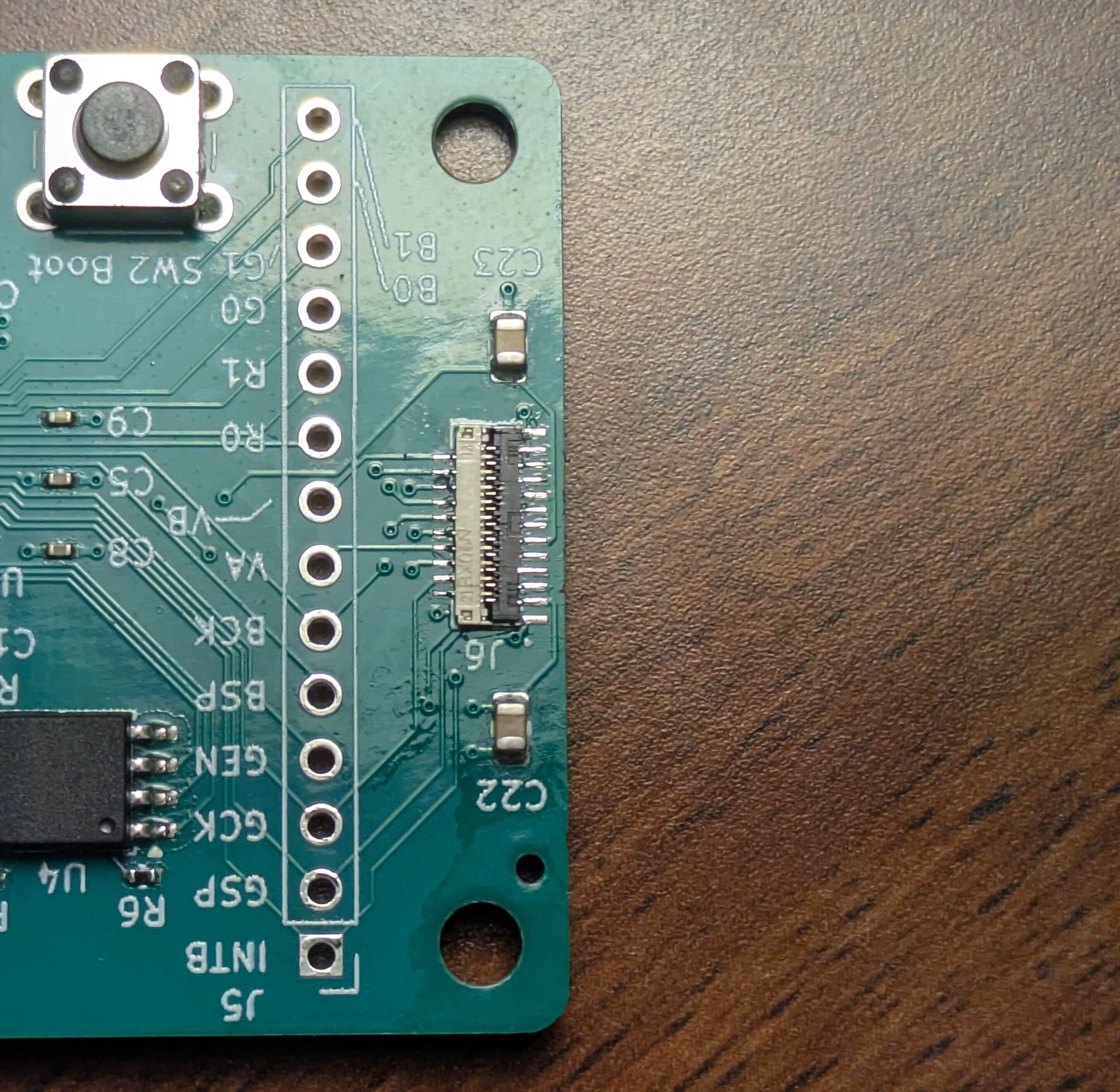 Initially, I guessed that the video signal was malformed, and while this ended up being correct because of the issue mentioned above, it's actually not the problem. Although the DMA problem caused the second frame to send only half a line of data and the third frame to stop running with BCK high, this doesn't matter if you don't wire the board correctly. I apparently never thought to check which pin Sharp labels as pin 1 on the display connector, so I accidentally inverted the connector footprint. I probably fried the display I was testing with, unless it can handle 5V on a random data pin, but the board is just fine. Unfortunately, the only way to fix this is to get a new board made.
