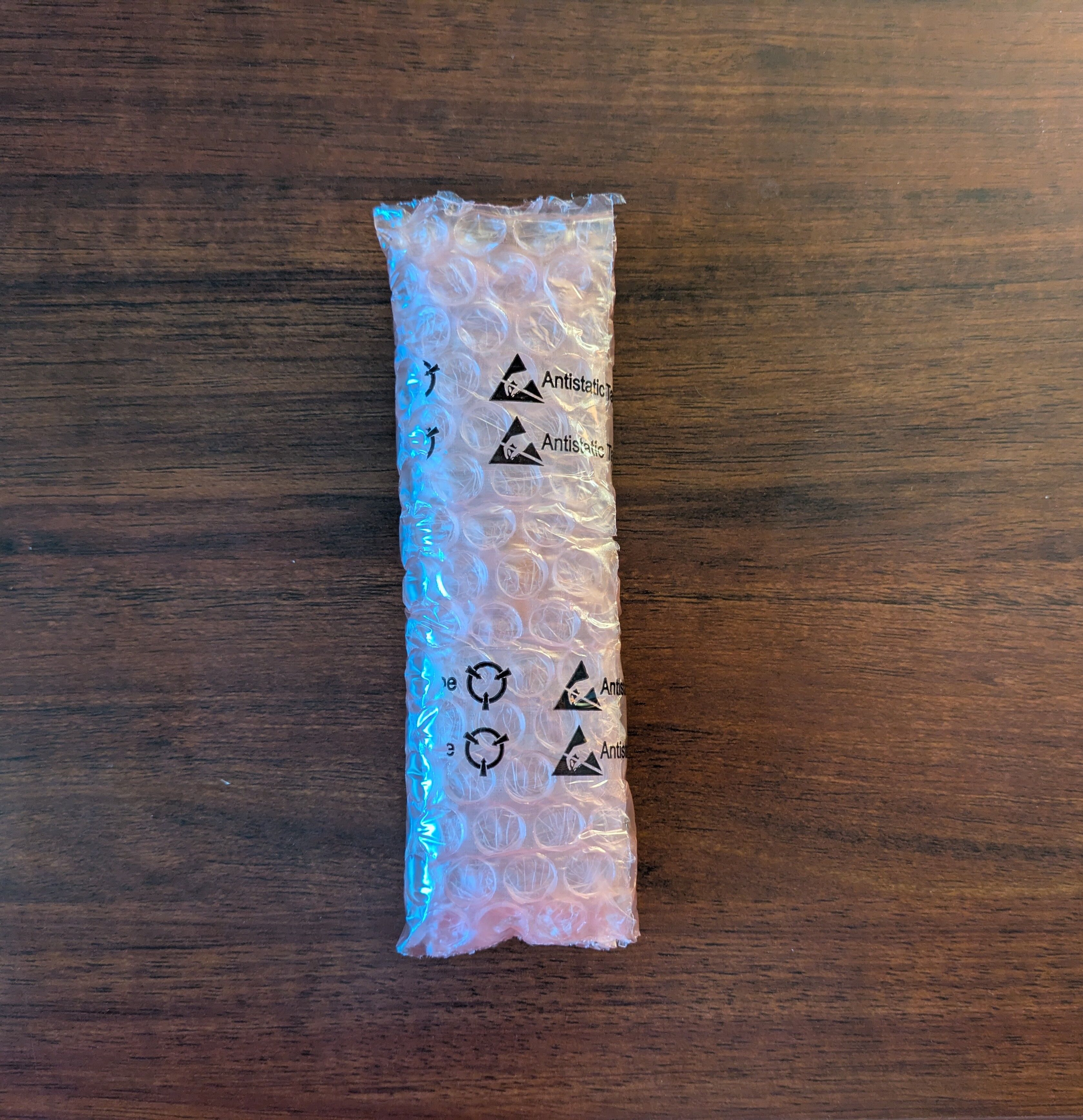 They're not much to look at, but here are some pictures of the rev 1 board and the display. I ordered 2 displays, and DigiKey shipped them wrapped in bubble wrap inside an anti-static bag. You can see the marks left by the bubbles on the surface of the display. I think these will clean off with some isopropyl (what Sharp recommends for cleaning) but I haven't tried yet.